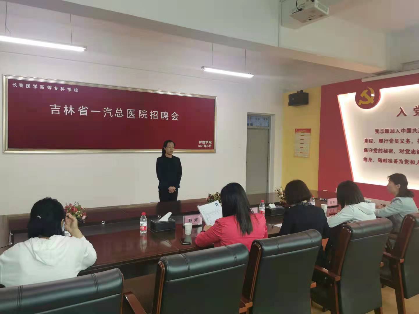 6月3日上午,我校护理学院举办吉林省一汽总医院专场招聘会。一汽总医院副院长张颖、组织人事部部长刘超、护理部主任赵辉一行参加本次招聘会,我校护理党总支书记高寒出席招聘会。