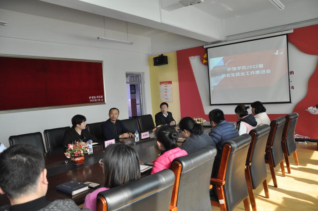 10月20日中午,护理学院在善学楼五楼会议室召开了2022届毕业生就业工作推进会。副书记陈贵锋,招生就业处副处长高雅静,护理学院负责人宋宇、学办相关人员及全体辅导员老师参加会议。