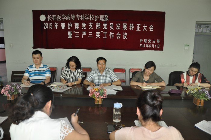 6月4日中午,护理党支部在善学楼五楼会议室召开了2014年春季党员发展转正大会暨“三严三实”工作部署会议。学工党总支书记刘丹丹、支部党员28人及相关教师参加了会议,会议由党支部副书记王宁主持。党员发展转正大会严格参照党员发展程序,经票决制,一致同意内外护理教研室马翠婷老师如期转正、同意吸收护理系2013级闫静等六名同学成为中共预备党员。决议通过,报请校党委批准。党支部书记袁兆新对马翠婷老师及全体入党同学表示祝贺,同时希望他们以此为新的起点,不断提升和完善自我,为教育及护理行业做出更大的贡献。“三严三实”工作会议上,袁兆新书记为支部全体同志讲授了第一堂党课。他向全体同志明确了开展“三严三实”活动的意义内涵及解决的问题,阐述了不严不实的危害,同时结合护理系各部门的相关工作,对“三严三实”进行和深入的解读。他向全体同志提出了明确的要求:以为党育人为己任,恪尽职守、对党忠诚,全力做好护理系各项工作。