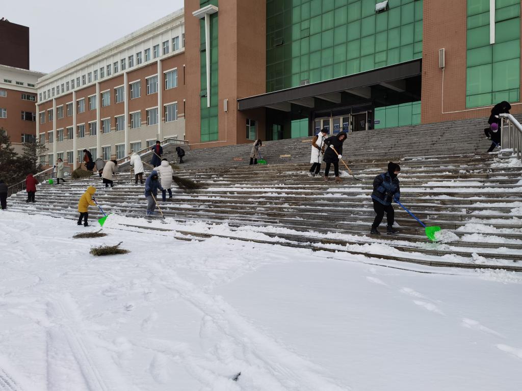 虽然天气寒冷,但大家劳动的热情不减,踊跃参与,争先恐后地拿着各种工具扫雪,你铲我扫,相互配合,干得热火朝天,不亦乐乎。忙碌的身影构成了一道亮丽的风景线,让这个飘雪的初春变得格外温暖。经过近一个小时的辛勤劳动,善学楼门前的积雪被清扫干净,保障了人员通行的安全。